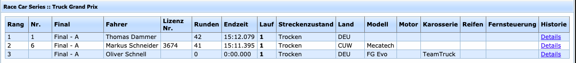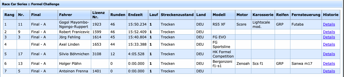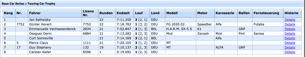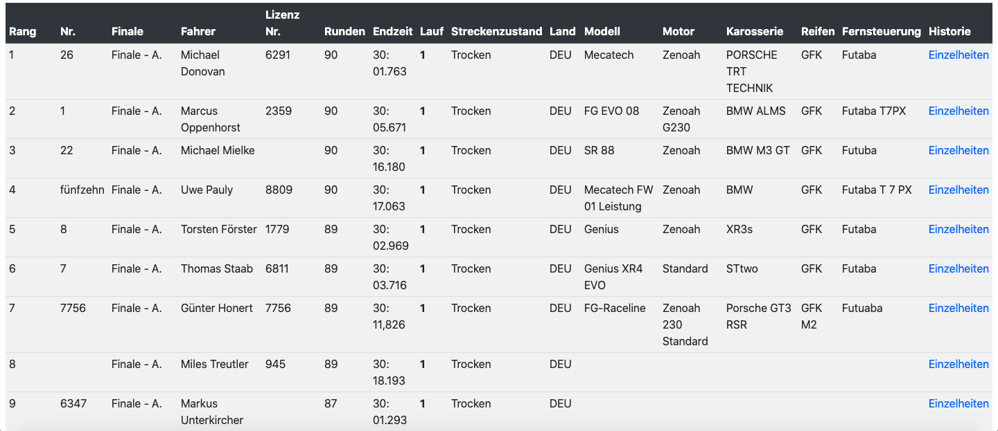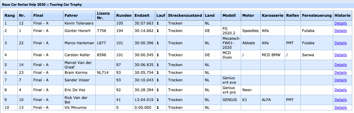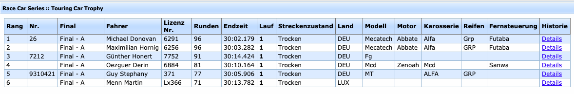 In the final, technical problems struck four drivers. From lap 34 onwards, the trouble started, and by lap 67, only six remained in the race. Of these six, the top three battled for the top spot on the podium until the very last lap. Andreas van Hüth ultimately secured the victory with an eight-second lead. It was a fantastic race. Up until lap 67, it was even a four-way battle. Gogol also had a great chance of winning, but a broken strut on his shock absorber dashed his hopes. Here are the results.