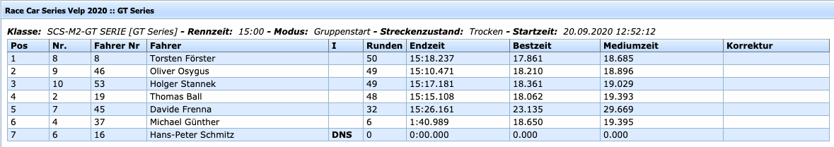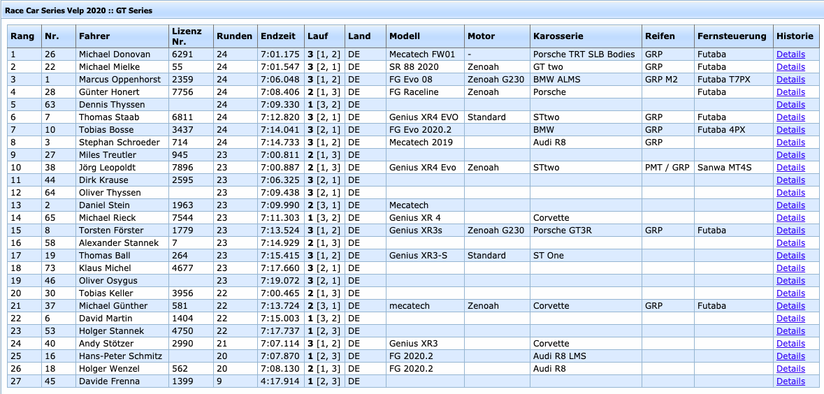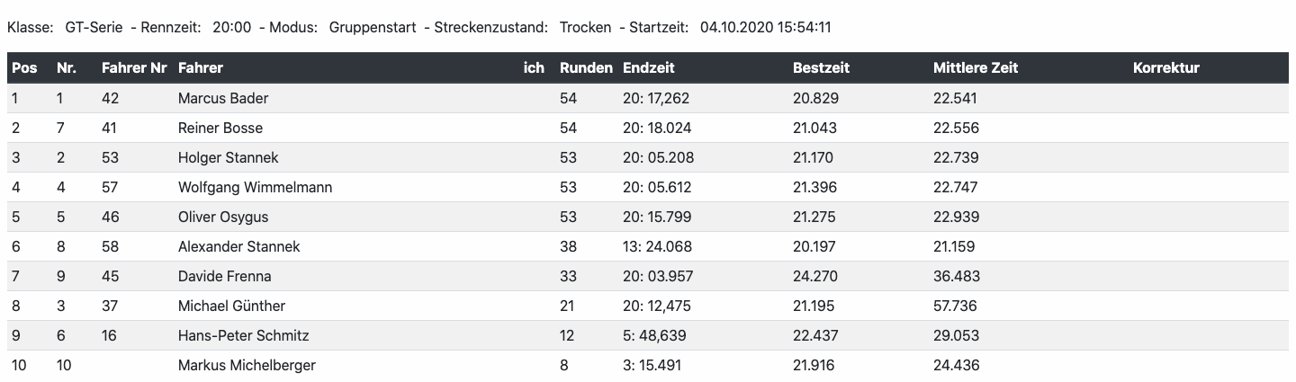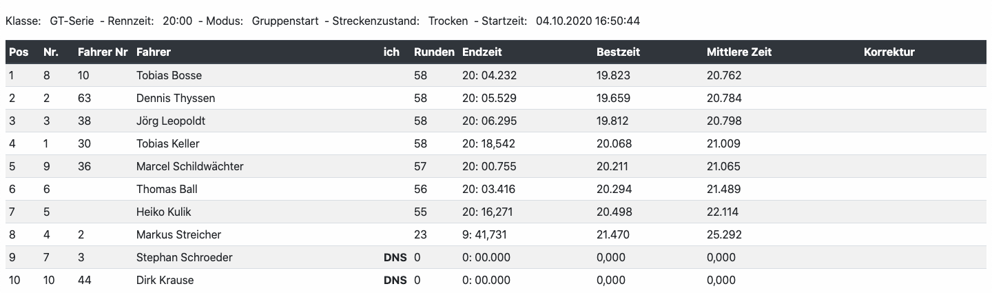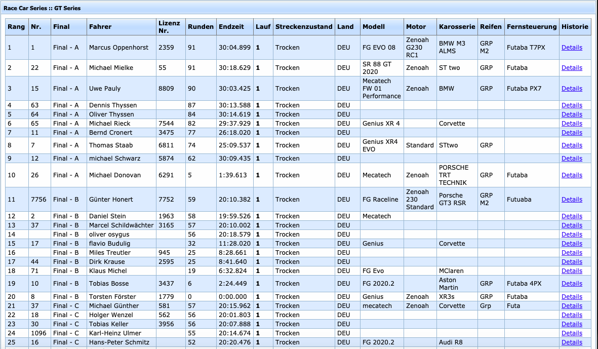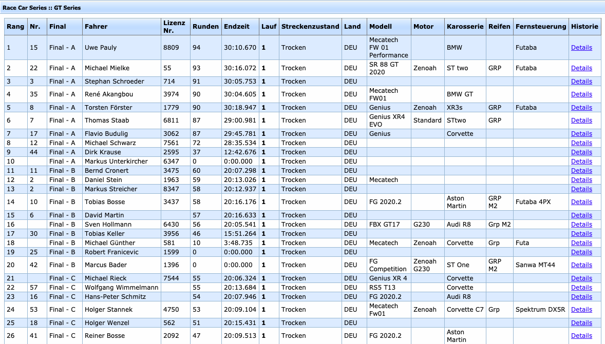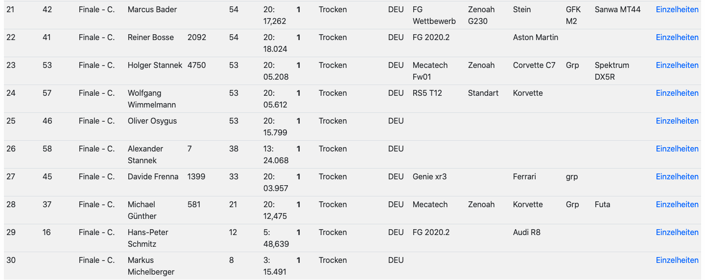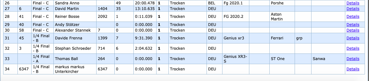 The C final was great. Unfortunately, five drivers were penalized by technical issues. A shame for them. The rest had a lot of fun over the 20 minutes, with many exciting battles. Places 1 to 5 were very close. Marcus Bader narrowly edged out Reiner Bosse. And places 3 to 5 were also very close, just shy of the podium. Congratulations to you all!