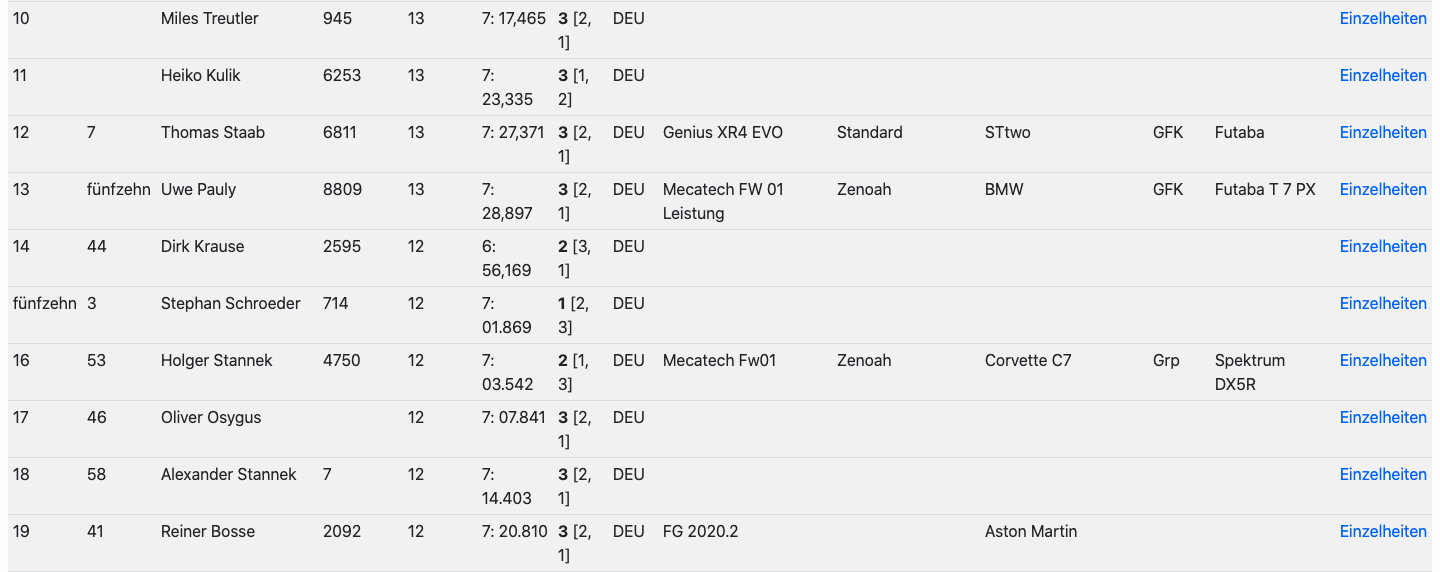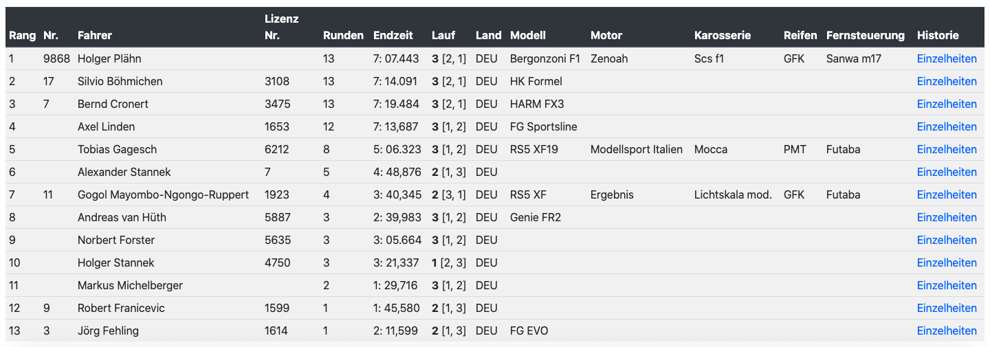 The B-final was incredibly exciting. The top-class field battled fiercely for 20 minutes, with Tobias Bosse ultimately taking the win. Second place, as in the Formula race, went to Alexander Stanneck. Torsten Förster finished third, just ahead of Oliver Thyssen. Thyssen, in turn, didn't have much of a lead over Tobias Keller, who, with Dirk and Oli in tow, was chasing fourth place. As you can see, it was a very close and thrilling race.