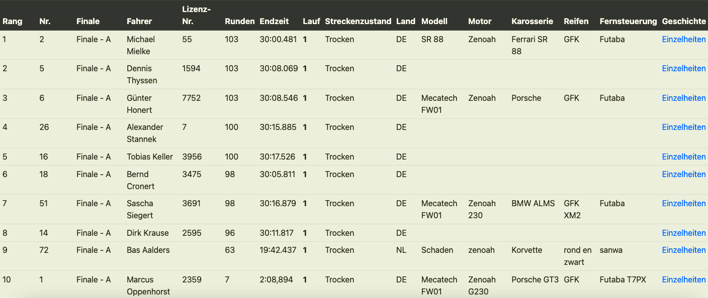 And so the A-Final got underway. From the starting line, three drivers pulled away from the pack. This trio was so tightly packed that you couldn't have squeezed a €10 note between them. Unfortunately, after 25 laps, Marcus Oppenhorst had to retire, as a broken insulator screw had already brought his race to an end. Michael consistently led the way, still closely followed by Günter. Günter then made an unplanned pit stop shortly before the finish when a rear wheel came off his car. This allowed Curt to secure second place. The results of the A-Final were as follows: